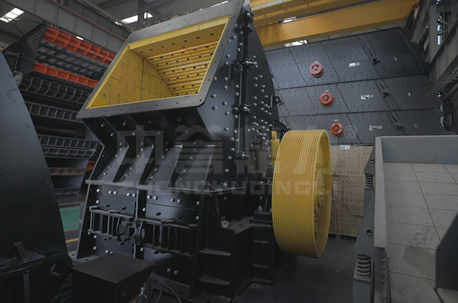 大塊原料通過給料機均勻的進入重錘破碎機的破碎腔,進入破碎腔后物料會先由高速旋轉的錘頭進行打擊完成初次破碎,同時會被打擊到機殼內部的襯板上再次進行破碎,直到小于出料口縫隙的物料從出料口排出,大于出料口的物料會重復上面的破碎,繼續被錘頭打擊,直到小于出料口被排出。