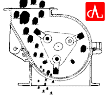 上圖是我們錘式破碎機的一個動畫簡圖,新鄉鼎力生產的錘式破碎機主要由進料口、轉子、反擊襯板、出料口等部分構成,由上圖我們可以清晰的看到,大塊的物料由進料口進入錘式破碎機的破碎腔,轉子上鑲嵌著多排錘頭(可根據客戶的需求進行組裝),在電機的帶動下,轉子高速旋轉,對大塊物料進行快速輪的打擊和沖擊,之后被破碎的物料會四散沖擊至四周的反擊襯板上,受到反擊襯板的反擊破碎,之后,物料之間會產生大面積撞擊形成自粉碎,粉碎后的小顆粒物料小于調節襯板縫隙大小的物料會透過出料口完成出料,剩下的大顆粒物料會留在破碎腔內繼續破碎。