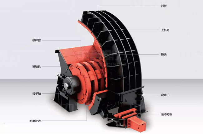 重型錘式破碎機的結構是由破碎腔、錘軸孔、錘頭、襯板、上機殼、護邊、觀察門、轉子軸、活動襯板等部件組成的。