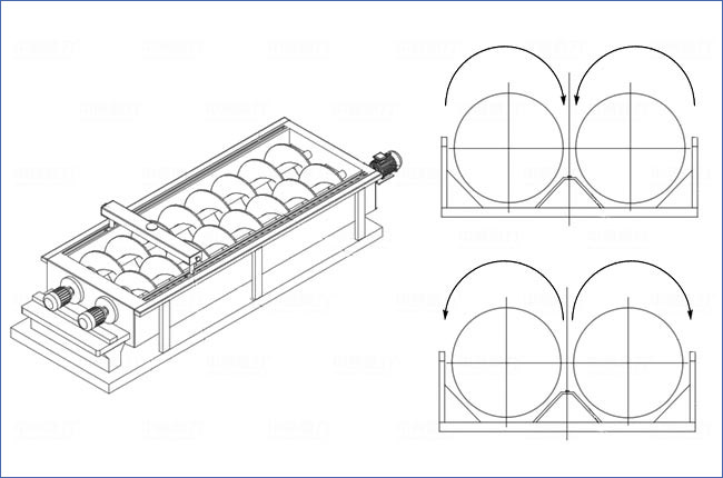為了將砂匯集到洗砂槽中部的排出槽體,雙螺旋洗砂機兩個螺旋是呈相反方向進行旋轉(zhuǎn),可以是相對旋轉(zhuǎn),也可以使相向旋轉(zhuǎn),如下圖所示。