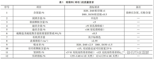 砂石骨料一般分為粗骨料和細骨料兩種,粒徑大于5mm的為粗骨料,小于5mm的為細骨料。粗骨料按粒徑80~150mm為特大石,40~80mm為大石,20~40mm為中石,5~20mm為細石;細骨料分為粗砂、中砂和細砂。骨料質量管理主要控制粗骨料的遜徑和細骨料的石粉含量及細度模數,混凝土用砂石骨料加工,質量要求詳見下表。