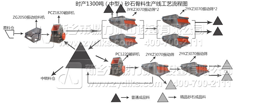 從流程工藝圖可以看到。物料從原料倉進入振動給料,勻速運動的物料被輸送至破碎機進行破碎,一部分破碎物料經過振動篩篩分出符合粒度物料,成為普通的成品砂石料。另一部分破碎物料被輸送至中轉料倉,可用于進行加工普通成品料的原材料,也可經過整形式破碎機破碎,獲得品質比較高的砂石骨料。