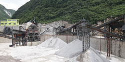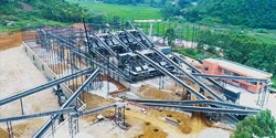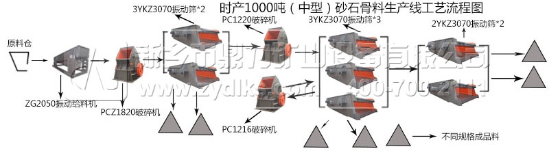 石料生產線在工作過程中,大塊石料經料倉由振動給料機均勻地送進重型錘式破碎機進行粗碎,粗碎后的石料由皮帶輸送機送入錘式破碎機(或反擊式破碎機)進行中碎,中碎后的石料由膠帶輸送機送進振動篩進行篩分,符合規(guī)格的石料和成品砂子(篩下物)由膠帶輸送機送至成品料堆;不符合規(guī)格的大顆粒石料(篩上物)由皮帶輸送機返回至錘式破碎機再次進行破碎處理,破碎后的石料再經過膠帶輸送機送進振動篩進行篩分,這樣形成閉路多次循環(huán)。