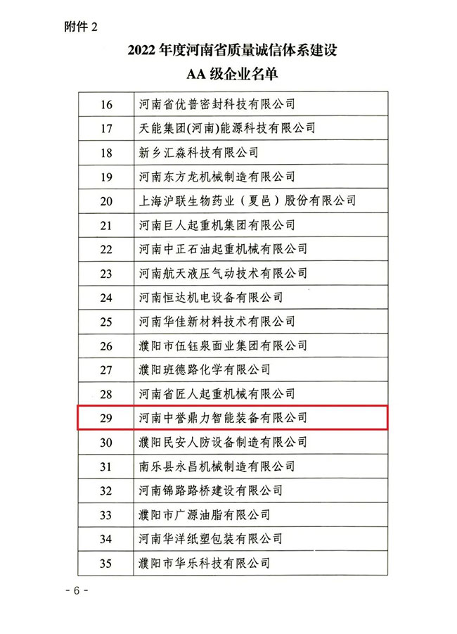 12月13日,河南省質量協會發布《關于公布2022年度河南省質量誠信體系建設A等企業名單的通知》,河南中譽鼎力智能裝備有限公司憑借的產品和服務質量順利獲評2022年度河南省質量誠信體系建設AA級企業名單