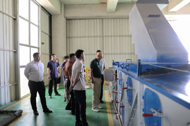在項目輸送車間,考察團成員著重了解了中譽鼎力創新產品箱式皮帶輸送機及其優勢,點贊該設備環保、省錢省力。
