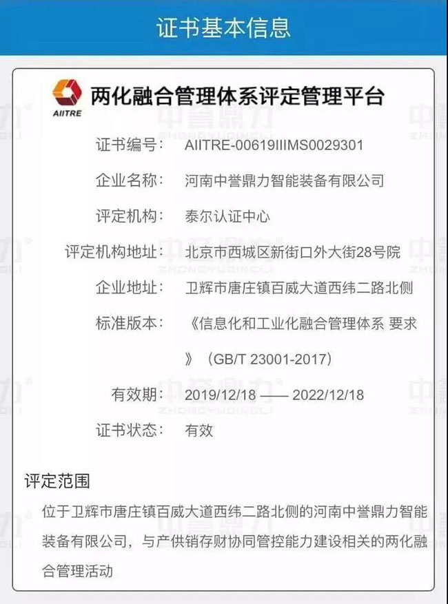 日前,河南中譽鼎力智能裝備有限公司正式通過兩化融合管理體系貫標(biāo)認(rèn)證,取得工信部的評定機構(gòu)頒發(fā)的“兩化融合管理體系評定證書”。
