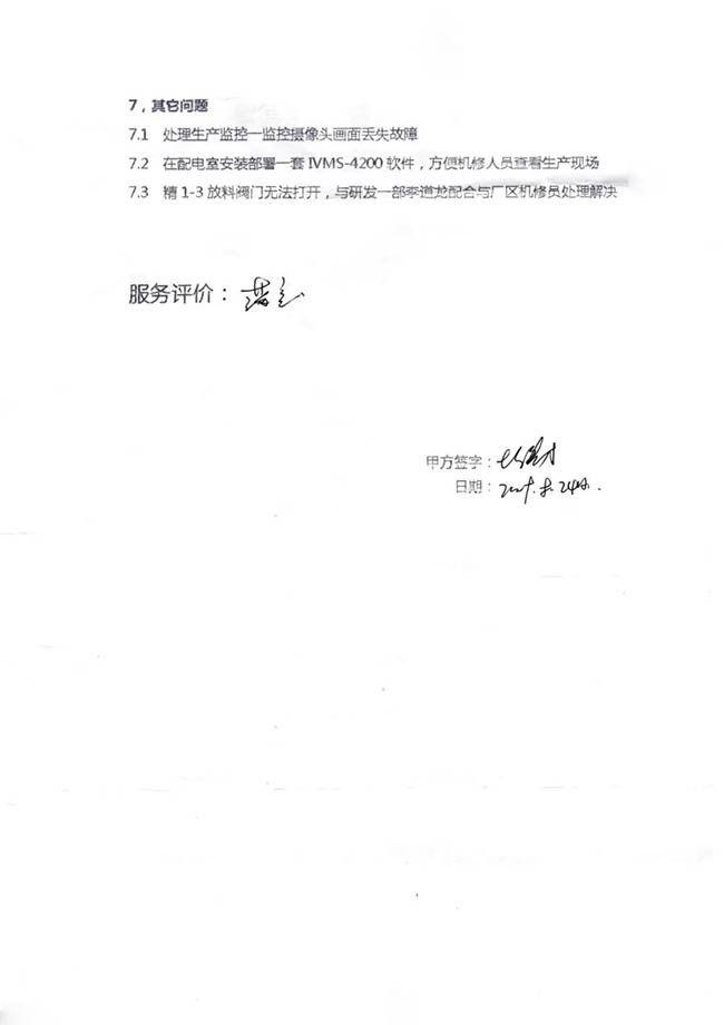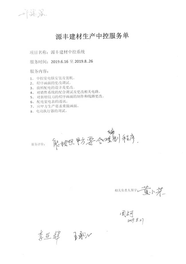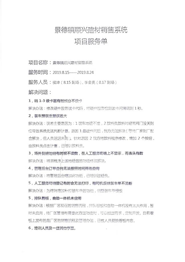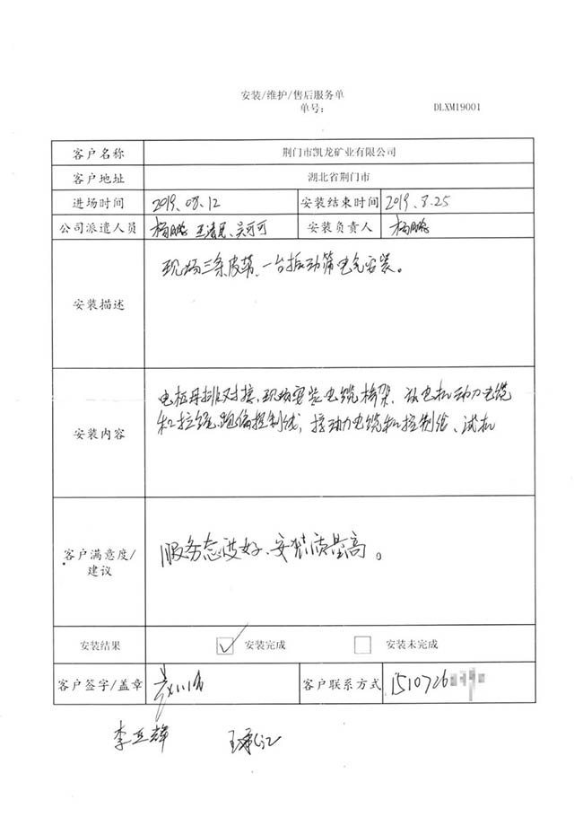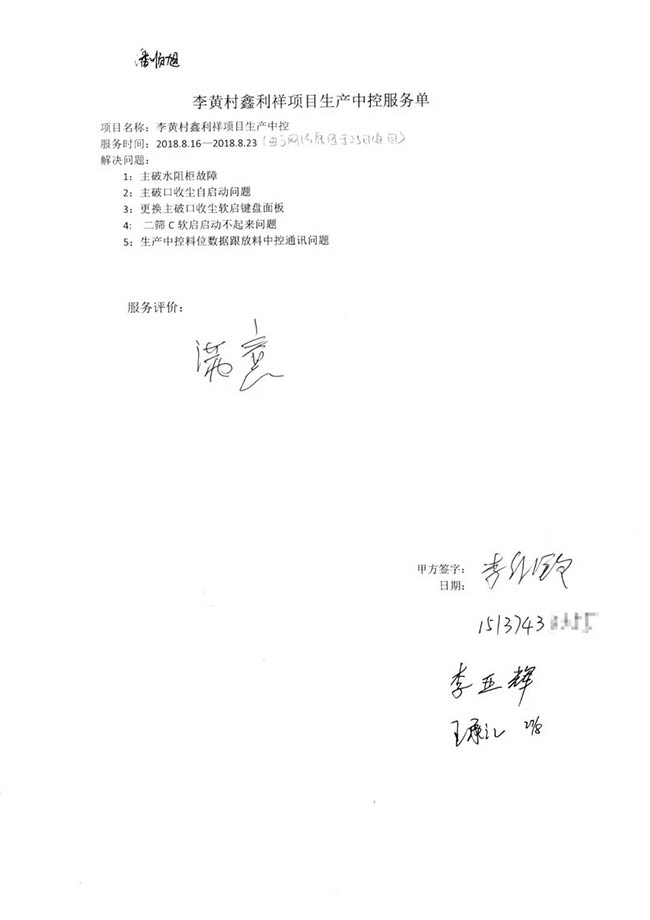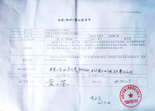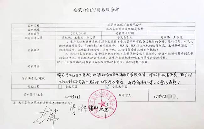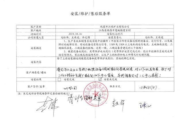 與客戶打交道的過程,不僅有電氣成套設備、低壓配電柜、礦山骨料生產(chǎn)線的管理軟件的安裝調試,還有監(jiān)控設備工程、電氣工程的施工等等。咨詢,設計,施工,調試,維護,培訓……如何做到每一個環(huán)節(jié)都精益求精,達到客戶要求?完善的質量管控和服務體系不可少。而“項目服務單”就是其中一項重要措施,記載并參與了服務的過程。