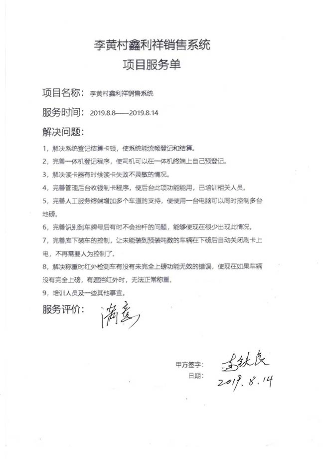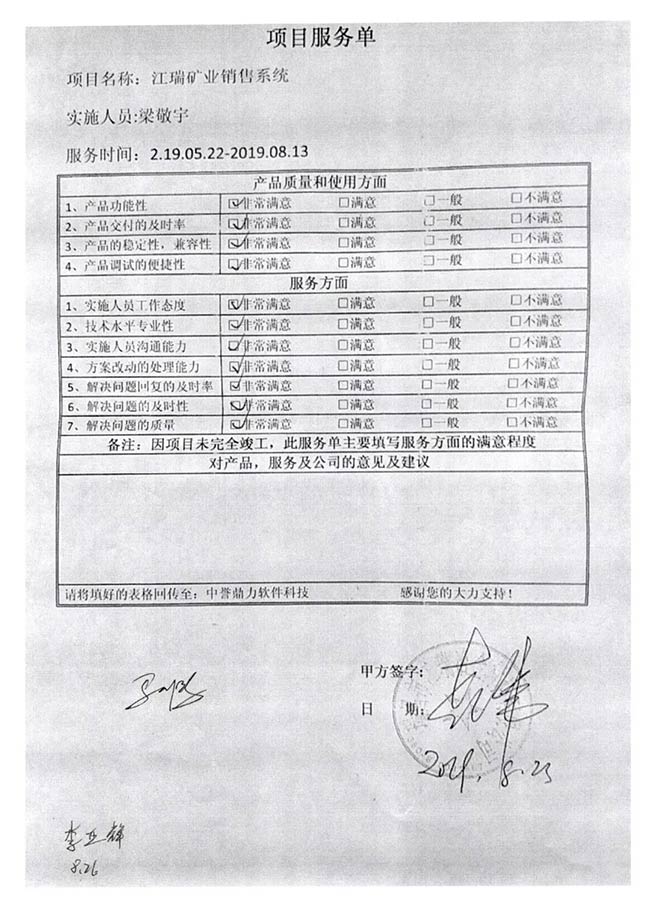 在中譽鼎力軟件科技股份有限公司,有一張“項目服務單”。這薄薄的一頁紙,記載了中譽鼎力員工去客戶現(xiàn)場進行智能礦山管理系統(tǒng)安裝、維護、售后、問題解決等各項細節(jié);也是中譽鼎力員工精細的施工品質、完善規(guī)范的管控機制,以及追求客戶滿意的服務理念的真實寫照。