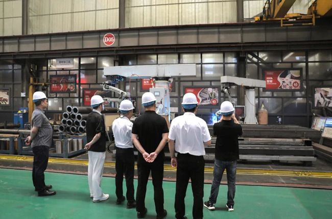 在中譽鼎力大型一體化智能車間,王順凡、杜凡新圍繞著公司的產品制造工藝流程、生產、加工細節等情況進行了介紹。