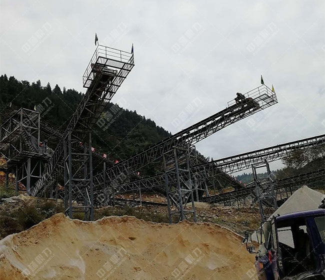 破碎流程:原料堆+ZSW490×110震動喂料機+HD98顎式破碎機+HXYS400圓錐式破碎機(2臺)+2YK2460礦山振動篩+2YK2160礦山振動篩+HVI1250制砂機+傳送機220米